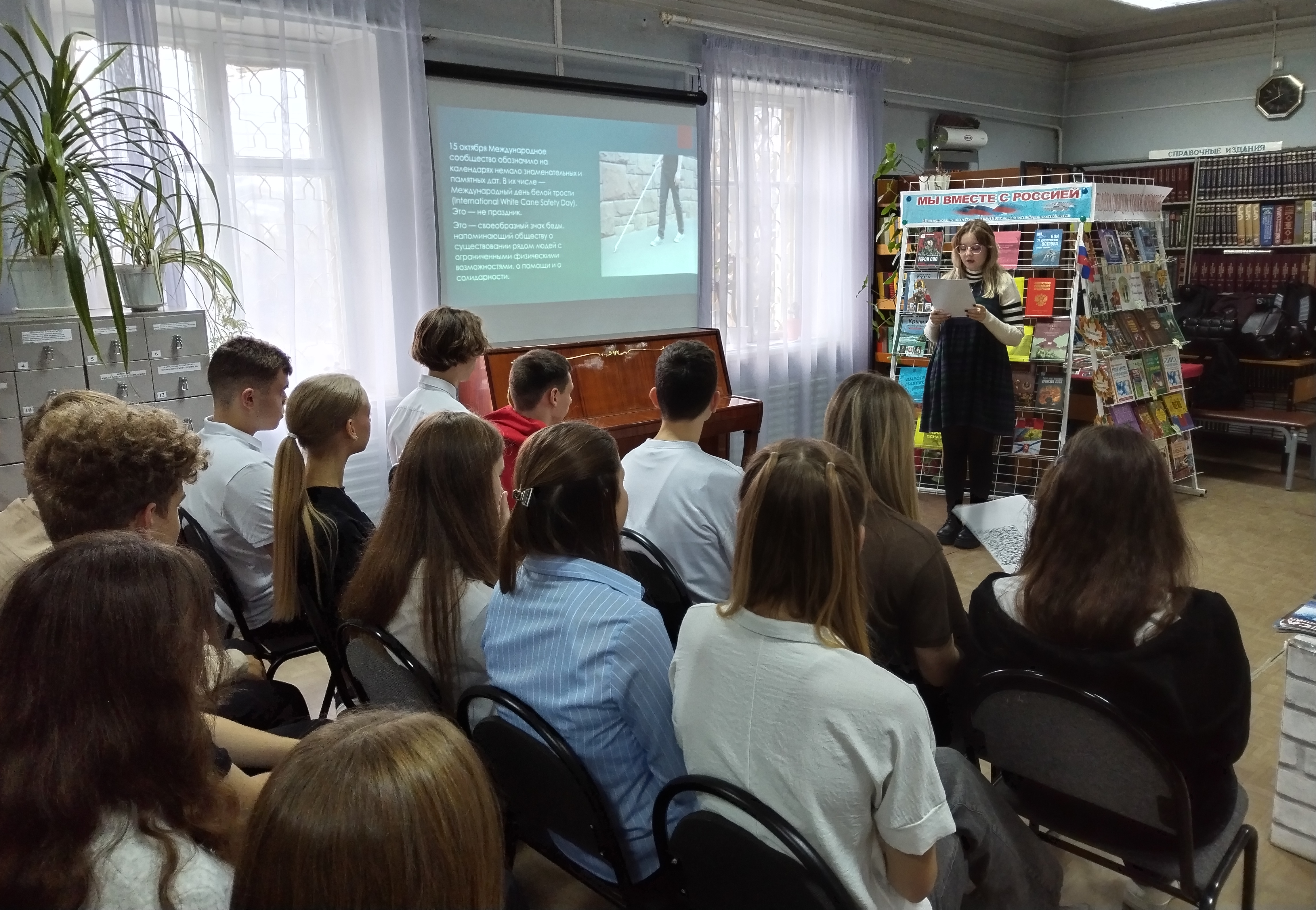 15 октября в библиотеке-филиале №7 (с. Верхнерусское) была оформлена информационная выставка «Человек с белой тростью». Все желающие могли познакомиться с историей возникновения дня «Белая трость», с правилами помощи слепым в магазине, на улице, в транспорте, а также показать, как живет в современном мире незрячий человек и каких успехов он может добиться.