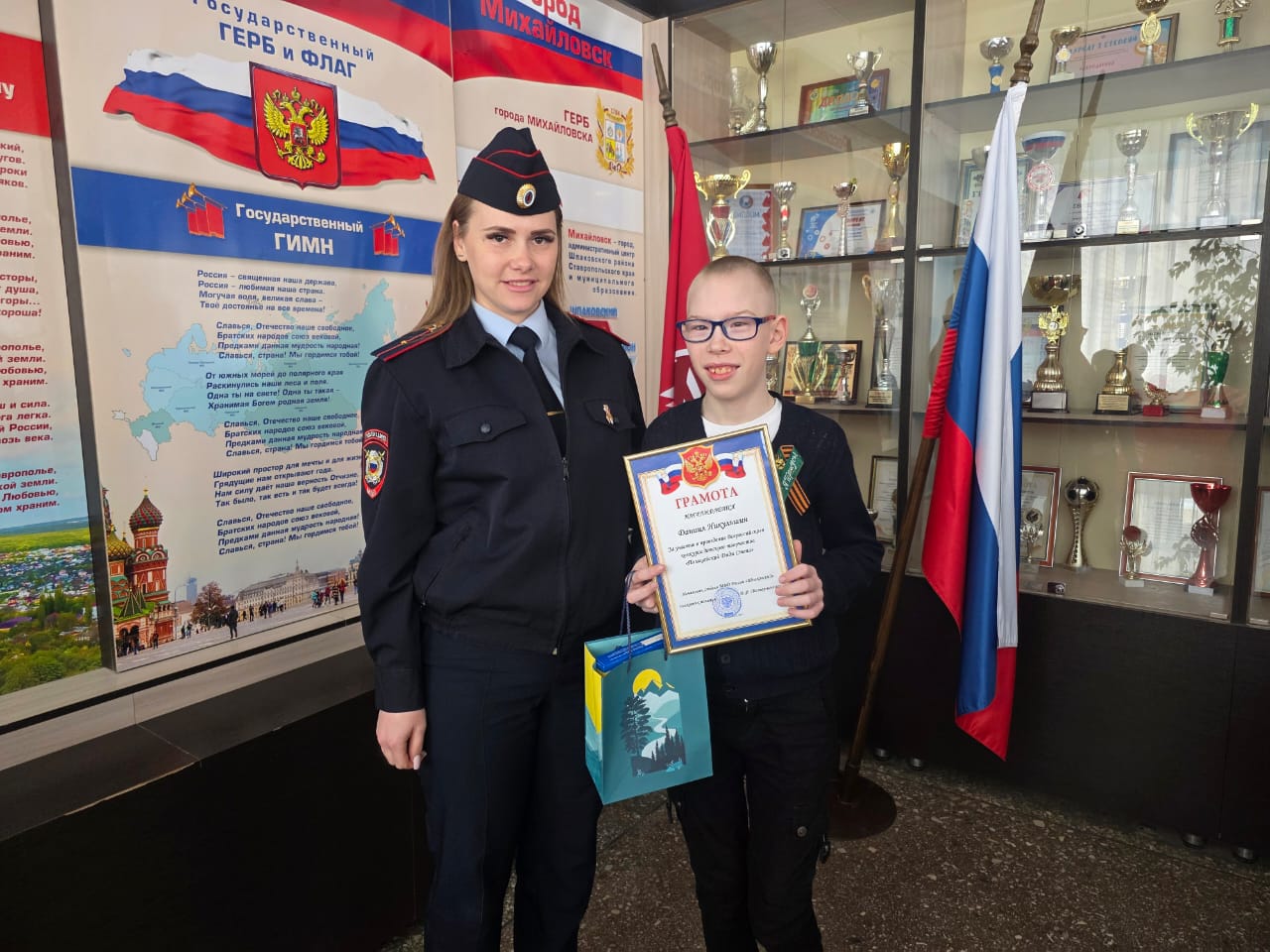За участие в проведении Всероссийского конкурса детского творчества «Полицейский Дядя Степа» школьнику торжественно вручили грамоту и сладкий подарок.