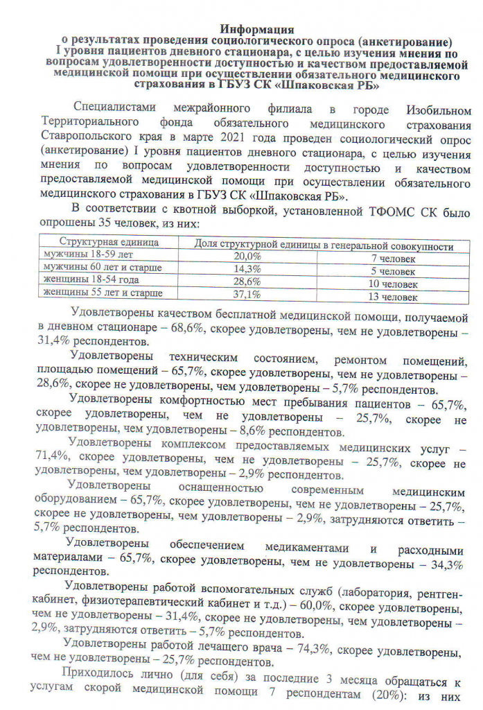 Информация о проведении социологического опроса (анкетирование) I уровня пациентов стационара, с целью изучения мнения по вопросам удовлетворенности доступностью и качеством предоставляемой медицинской помощи при осуществлении обязательного медицинского..