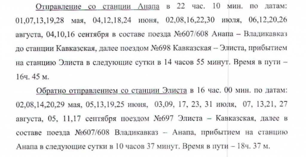 С 21 апреля по 17 сентября 2022 года открыто железнодорожное сообщение по маршруту "Элиста-Анапа" периодичностью один раз в неделю, в составе поезда два купейных и два плацкартных вагона.