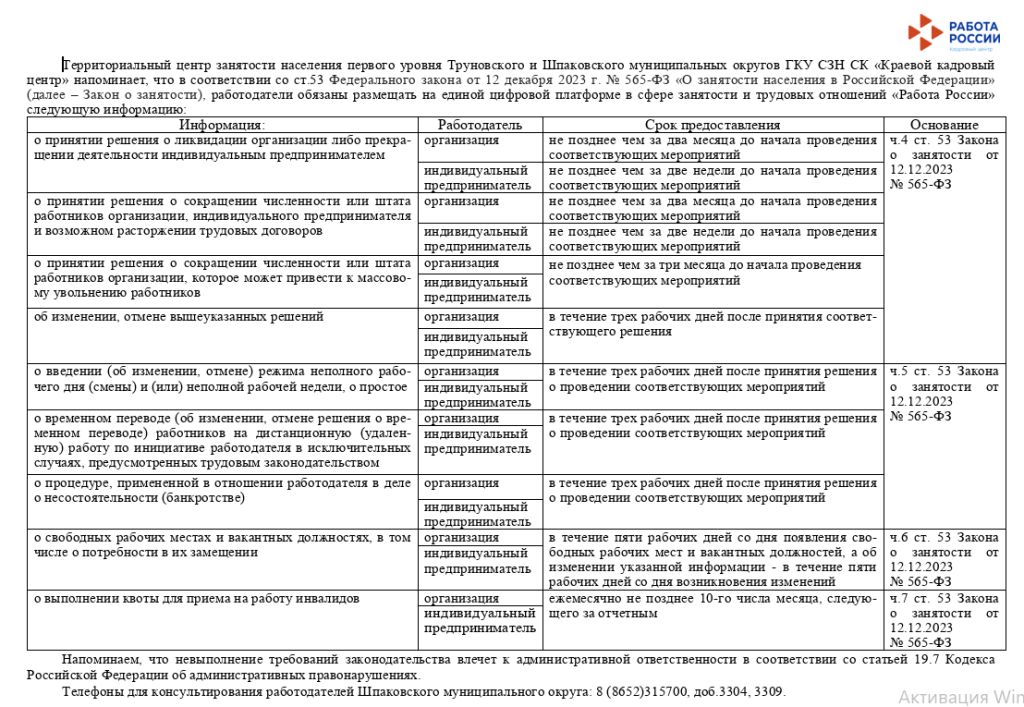 Территориальный центр занятости населения первого уровня Труновского и Шпаковского муниципальных округов ГКУ СЗН СК «Краевой кадровый центр» напоминает!