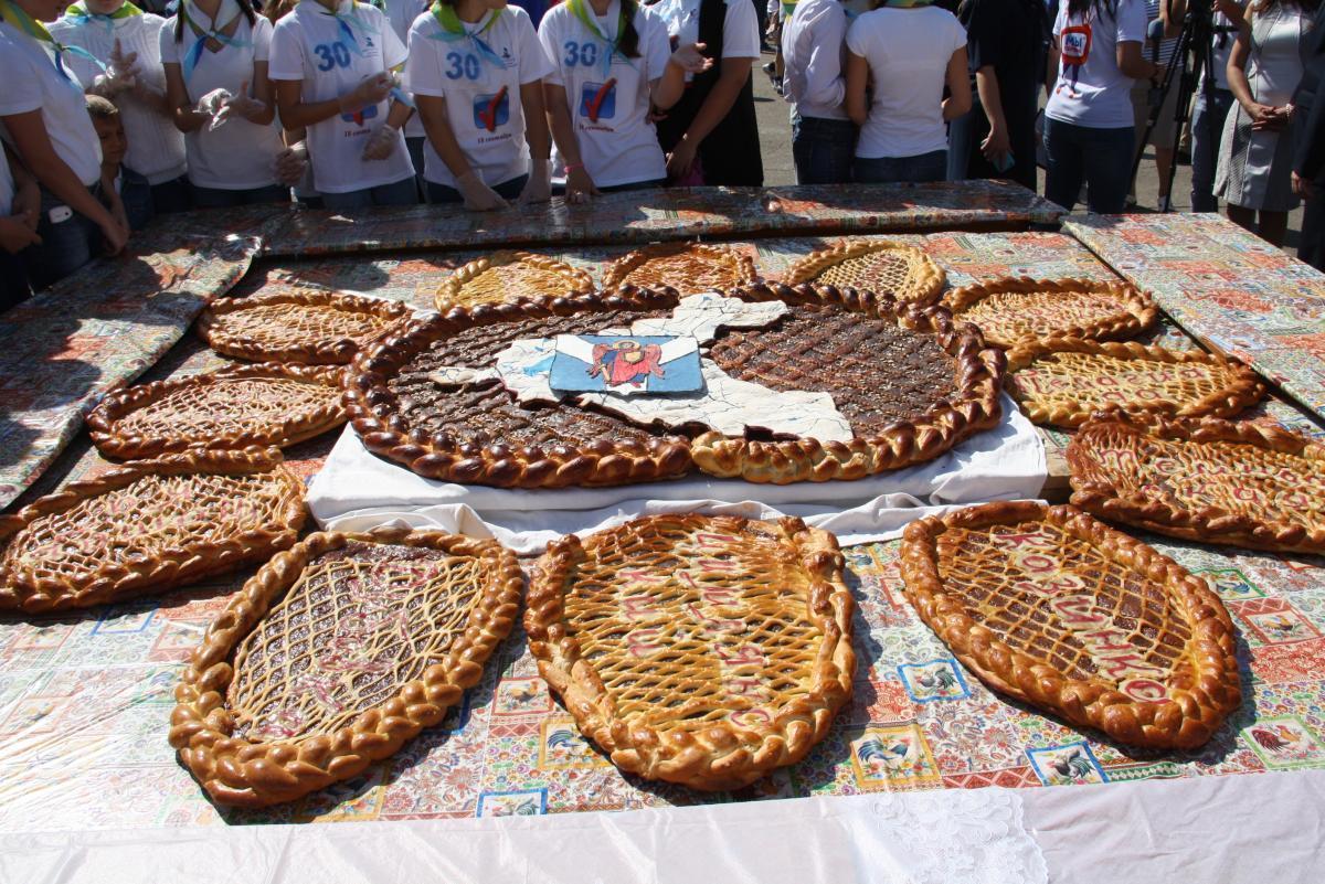 На середину площади тем времени собирается народ, чтобы стать в дружный хоровод вокруг именинного пирога. Кстати, печеные изделия на праздник приготовили все поселения района, достойно представив их на фестивале. Главный же пирог, диаметром около трех метров, смогли отведать все желающие.