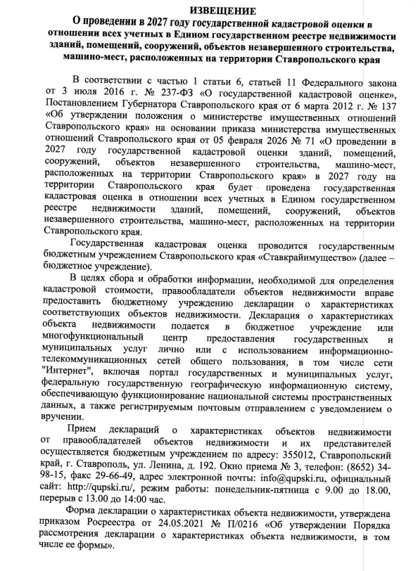 Извещение о проведении в 2027 году государственной кадастровой оценки