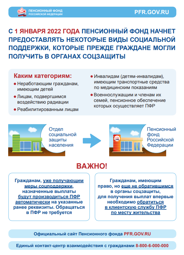 С 1 ЯНВАРЯ 2022 ГОДА ПЕНСИОННЫЙ ФОНД НАЧНЕТ ПРЕДОСТАВЛЯТЬ НЕКОТОРЫЕ ВИДЫ СОЦИАЛЬНОЙ ПОДДЕРЖКИ, КОТОРЫЕ ПРЕЖДЕ ГРАЖДАНЕ МОГЛИ ПОЛУЧИТЬ В ОРГАНАХ СОЦЗАЩИТЫ