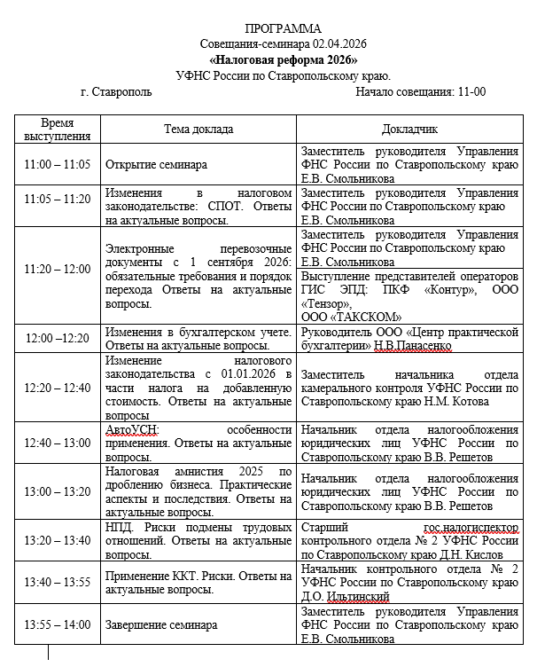 ПРОГРАММА Совещания-семинара 02.04.2026 «Налоговая реформа 2026» УФНС России по Ставропольскому краю.